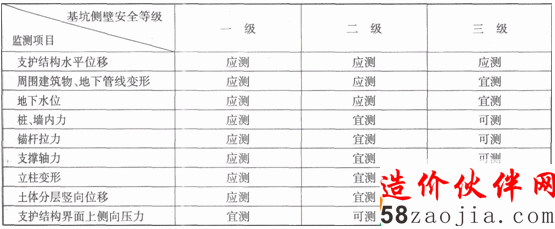 市政管理与实务知识:各安全等级的基坑需监测的项目