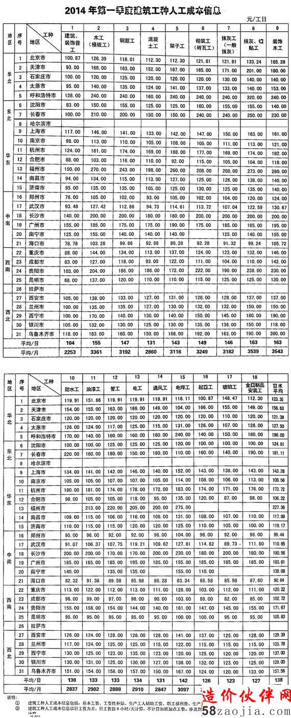 】2014年全国第一季度建筑工种人工成本信息价格具体内容如下表所示: