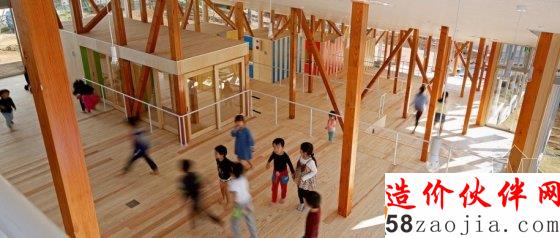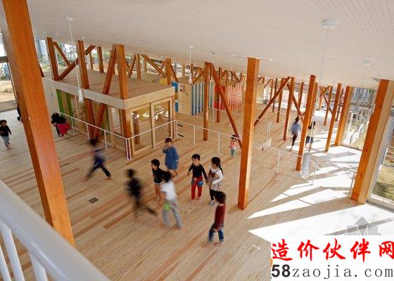 内侧被喷上不同颜色的条纹,包括黄色、绿色、红色和蓝色。每层的剩余部分为玩耍区,装有白色金属栏杆,能够在边缘处提供保护。根据建筑师的设计,这种布局使幼儿园类似一座大房子,不同年龄段的孩子们可以相互交流。“举例来说,这座‘大房子’有一个独特的功能,三岁孩子可以与五岁孩子同处一个房间,这些不同年龄段的孩子能够在一个宽敞的房间里互动,” 山崎健太郎说道。