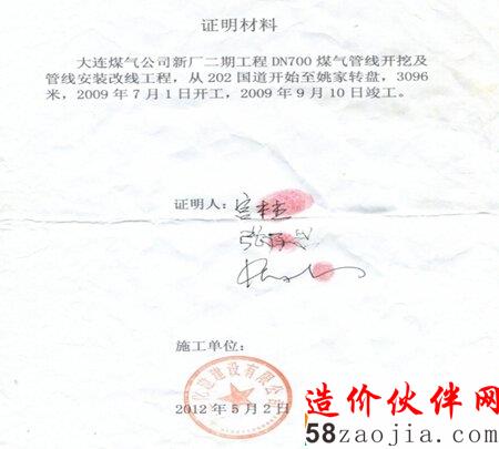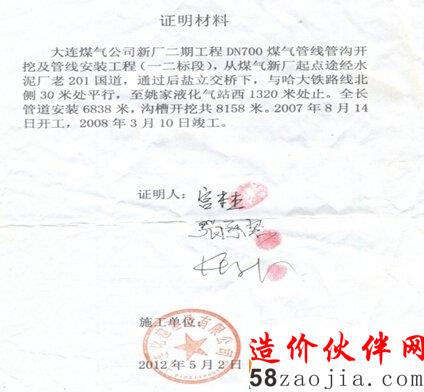 孙延彬为了证明第三标段工程确实是他本人所施工,于2012年5月2日,他找到了当时现场指挥施工的大连燃气公司项目负责人张新民,张承恩以及大连化建建设有限公司负责人宫本杰,他们给出具了一份第三标段确为孙延彬所施工的证明。