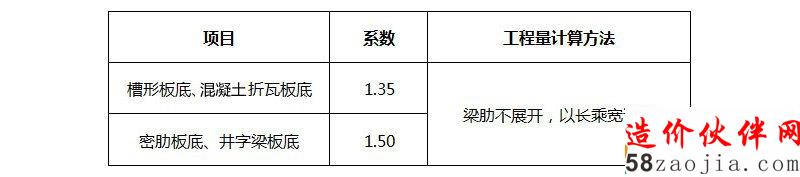 2、槽形板底、混凝土折瓦板、密肋板底、井字梁板底抹灰工程量按下表规定乘以系数计算: