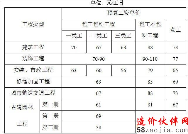关于调整建筑、装饰、安装、市政、修缮加固、城市轨道交通、仿古建筑及园林工程预算工资单价的通知