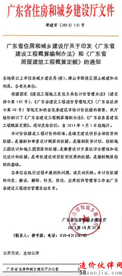 根据国家《建筑工程施工发包与承包计价管理办法》(建设部令107号)、《广东省建设工程造价管理规定》(广东省政府令第40号)等规定和我省完善建筑市场计价依据的需要,我厅组织制定了《广东省建设工程概算编制办法》、《广东省房屋建筑工程概算定额》。现印发给你们,自2014年4月1日起实行。