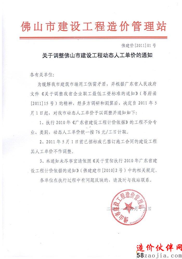 关于调整佛山市建设工程动态人工单价的通知