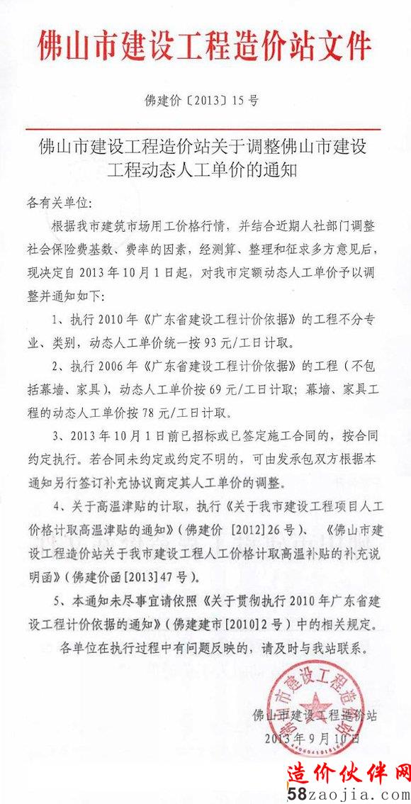 新闻:昨日,佛山市建设工程造价站根据该市建筑市场的用工价格行情以及人社部门的社会保险费技术和费率因素,通过考量测算和征求多方意见,对该市的定额动态人工单价作出调整,调整后的单价自2013年10月1日期实行。通知文件具体内容见下图: