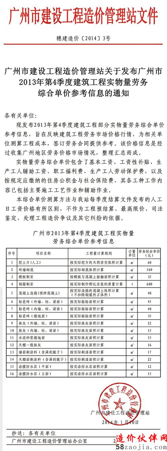 [广州]2013年第4季度实物量劳务综合单价发布通知