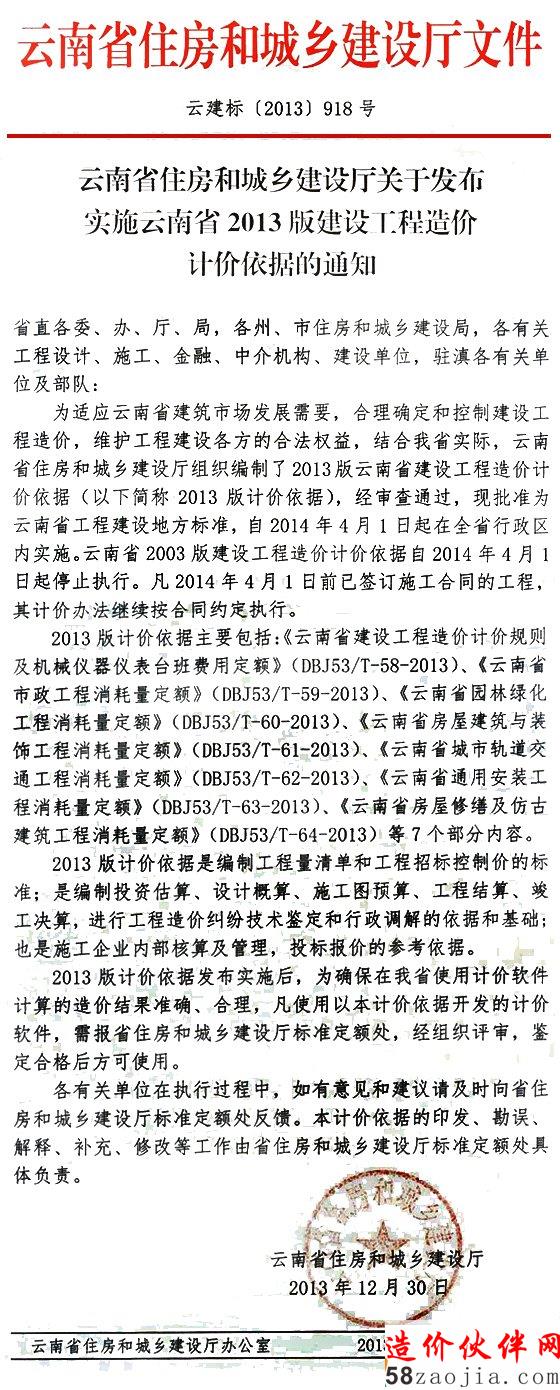 为适应云南省建筑市场发展需要,合理确定和控制建设,维护工程建设各方的合法权益,结合我省实际,云南省住房和城乡建设厅组织编制了2013版云南省建设工程造价(以下简称2013版计价依据),经审查通过,现批准为云南省工程建设地方标准,自2014年4月1日起在全省行政区内实施。云南省2003版建设工程造价计价依据自2014年4月1日起停止执行。凡2014年4月1日前已签订施工合同的工程,其计价办法继续按合同约定执行。