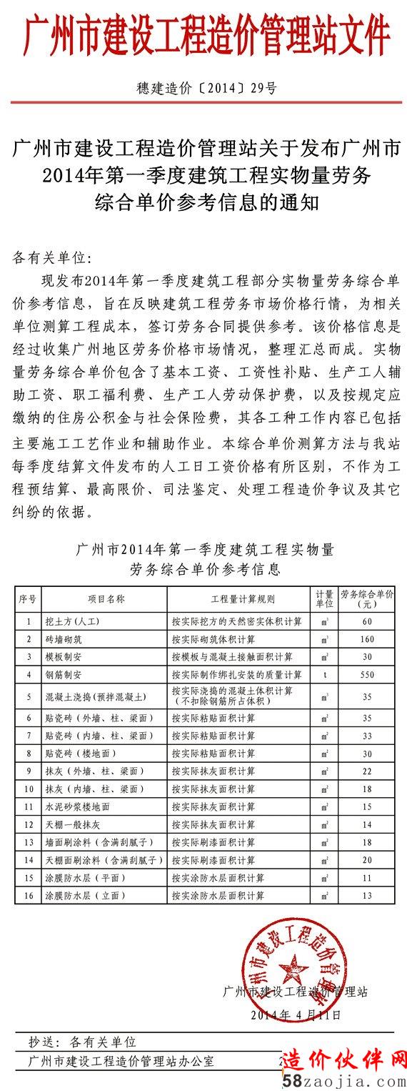 [广州]2014年一季度建筑工程实物量劳务综合单价