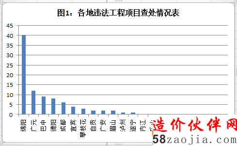 从查处的违法工程项目数量看,绵阳、广元、巴中、德阳、成都、宜宾、攀枝花7个地区查处力度大,分别为40个、12个、9个、8个、6个、4个、3个(见图1)。