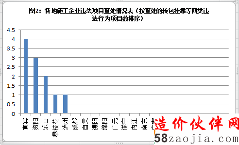 从检查施工企业查处的转包、挂靠等四类违法行为看,宜宾、资阳、乐山3个地区查处的转包、挂靠等四类重点违法行为项目数较多,分别是4个、3个、2个(见图2)。