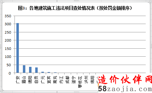 从行政罚款的金额看,广安、眉山、德阳、自贡4个地区查处力度大,分别是305.3万元、46万元、37.4万元、34.5万元(见图3)。