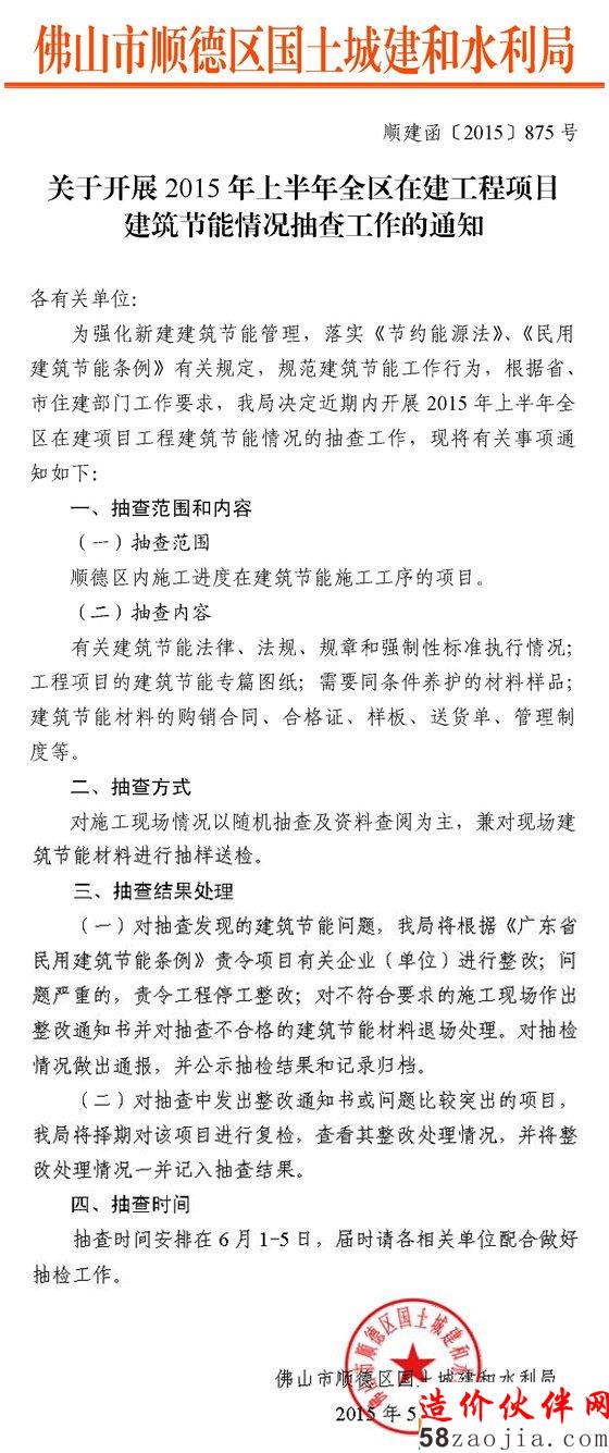 附件:佛山市顺德区土城建和水利局关于开展2015年上半年全区在建工程项目建筑节能情况抽查工作的通知 顺建函[2015]875号