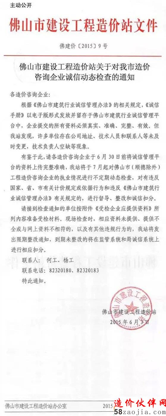 日前,佛山市建设工程造价站发布了关于对我市造价咨询企业诚信动态检查的通知,通知具体内容如下: