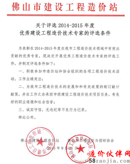 据信息网了解,日前,佛山市建设工程造价站发布了“关于评选2014-2015年度优秀建设工程造价技术专家的评选条件”,通知公告文件具体内容如下图所示: