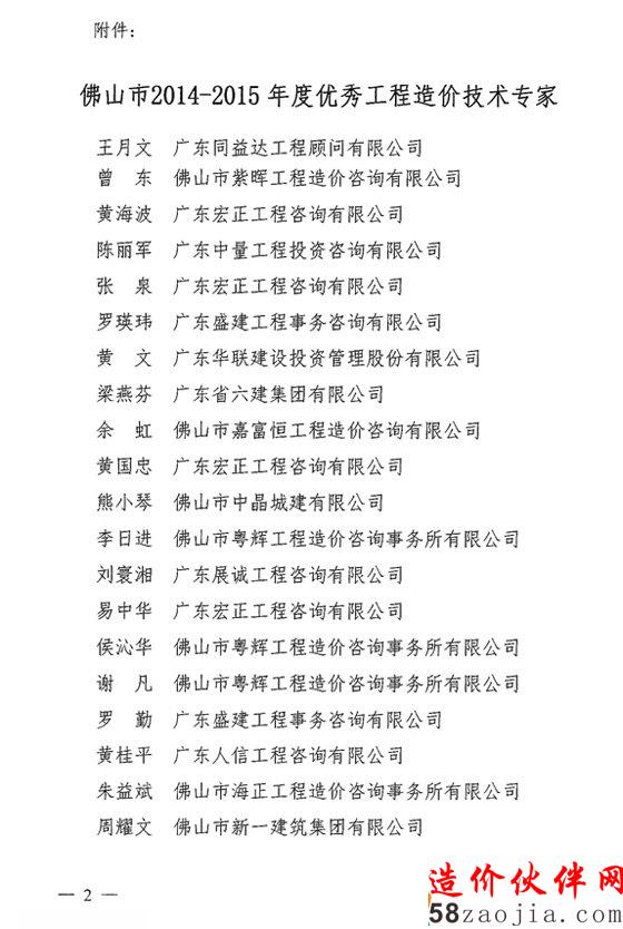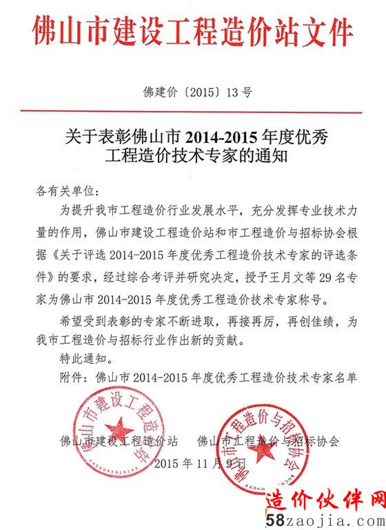 [广东]关于表彰佛山市2014-2015年度优秀工程造价技术专家的通知
