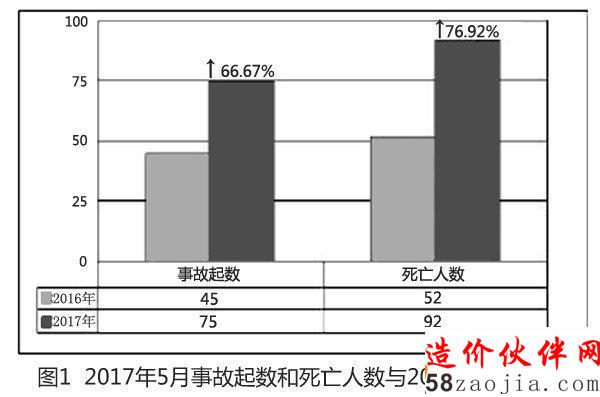 日前,住房和城乡建设部安全生产管理委员会办公室通报了2017年5月房屋市政工程生产安全事故情况。5月,全国共发生房屋市政工程生产安全事故75起、死亡92人,比去年同期事故起数增加30起、死亡人数增加40人,同比分别上升66.67%和76.92%(见图1)。