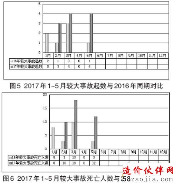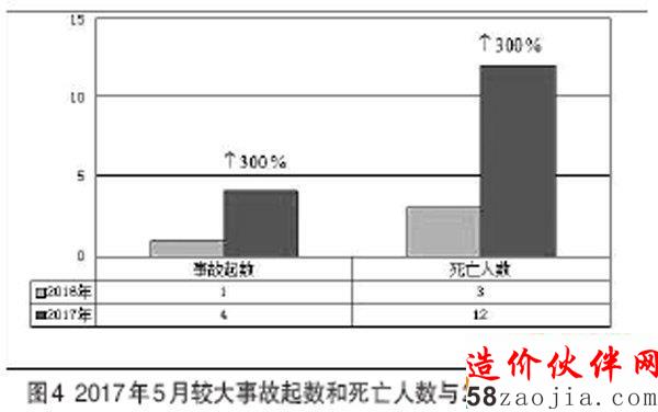 2017年5月,全国共发生房屋市政工程生产安全较大事故4起、死亡12人,比去年同期事故起数增加3起、死亡人数增加9人,同比均上升300%(见图4)。