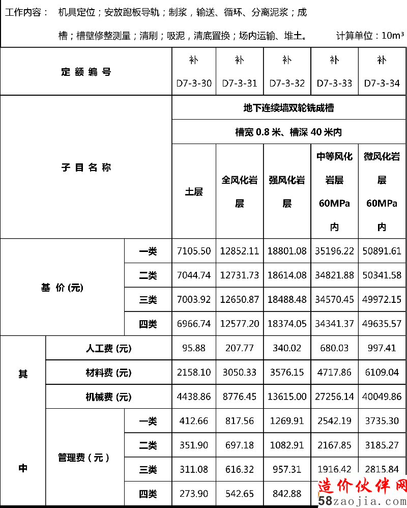 3、本项目按设计成槽深度40m内考虑的,设计成槽深度超过40m时,40m~60m部分,定额调整系数为1.10,超过60m部分,定额调整系数为1.20。
