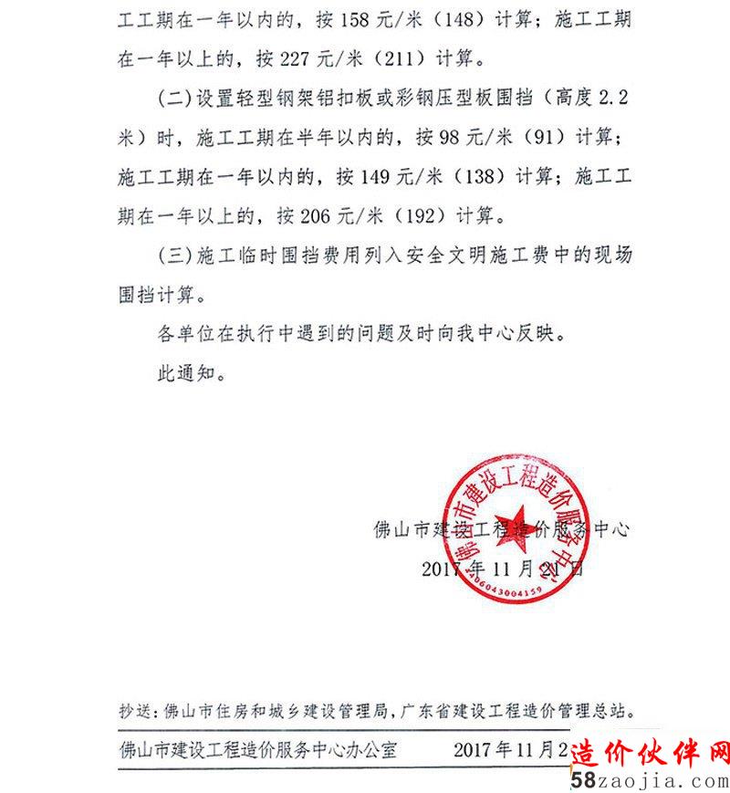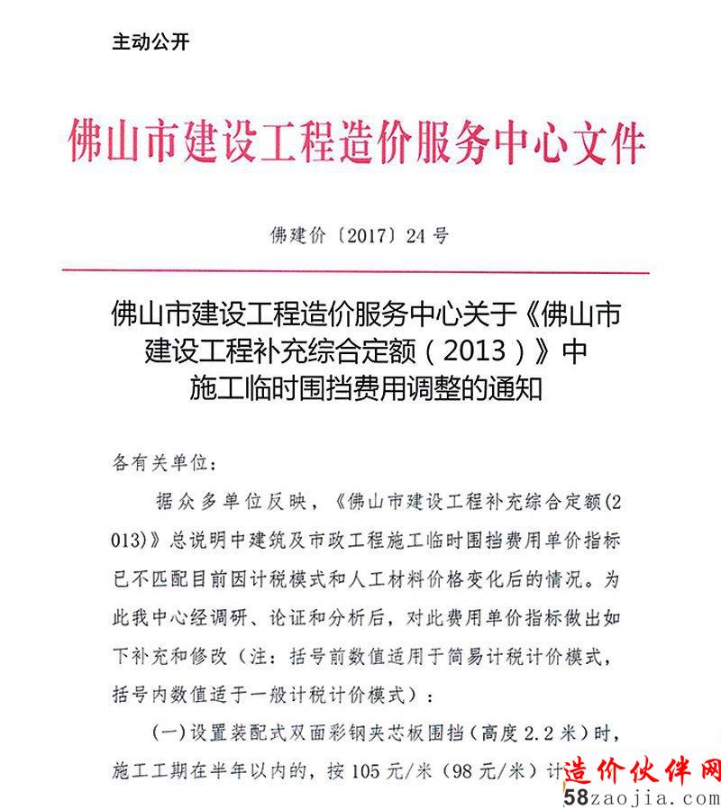 日前,佛山市建设工程造价服务中心正式印发关于《建设工程补充综合定额(2013)》中施工临时围档费用调整的通知,通知具体内容如下图文件所示: