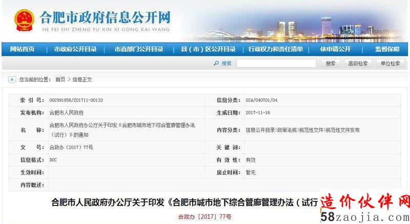 合肥市人民政府办公厅关于印发《合肥市城市地下综合管廊管理办法(试行)》的通知