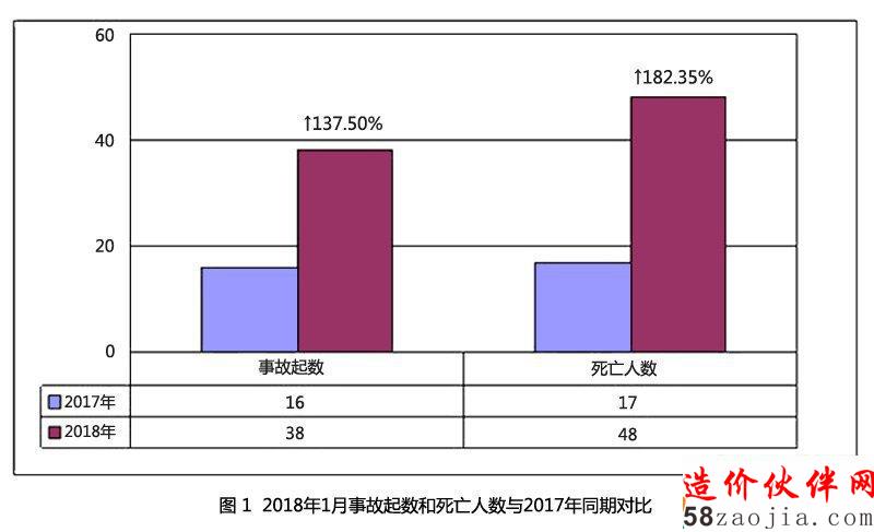 2018年1月,全国共发生房屋市政工程生产安全事故38起、死亡48人,比去年同期事故起数增加22起,死亡人数增加31人,同比分别上升137.50%和182.35%(见图1)。