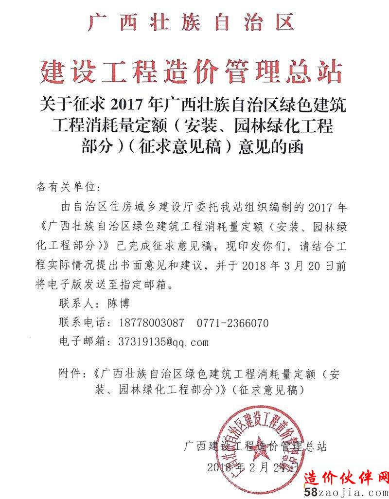 由自治区住房城乡建设厅委托我站组织编制的2017年《壮族自治区绿色建筑工程消耗量定额(安装、园林绿化工程部分)》已完成征求意见稿,现印发你们,请结合工程实际情况提出书面意见和建议,并于2018年3月20日前将电子版发送至指定邮箱。
