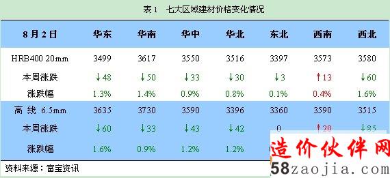 本周:7月钢铁业PMI指数为52.5%,年内第二次处于荣枯线以上,尤其是新订单指数和购进价格指数明显上升,而产成品库存指数大幅下降,显示出钢市积极因素缓慢积聚。但值得注意的是,生产指数仍居高位,粗钢产量日后继续回升则利空行情发展。考虑市价经过了一个月的强势拉涨,续涨动力不足,可钢厂多上调,利弊均存,行情缺乏明确方向。◆ 本周建材市场小幅走弱