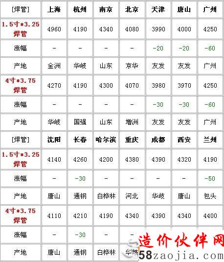 兰州焊管成交乏力。今日早盘,兰州焊管大户报价开始下调价格,中小户商家紧随其后,跌幅40-/吨。兰州市场暂时表现并未过分消极,由于前期价格一直处于高位,本次调价幅度基本在合理范围内。预计,在整体市场运行不佳的状态下,兰州焊管价格不排除加速下跌的可能。