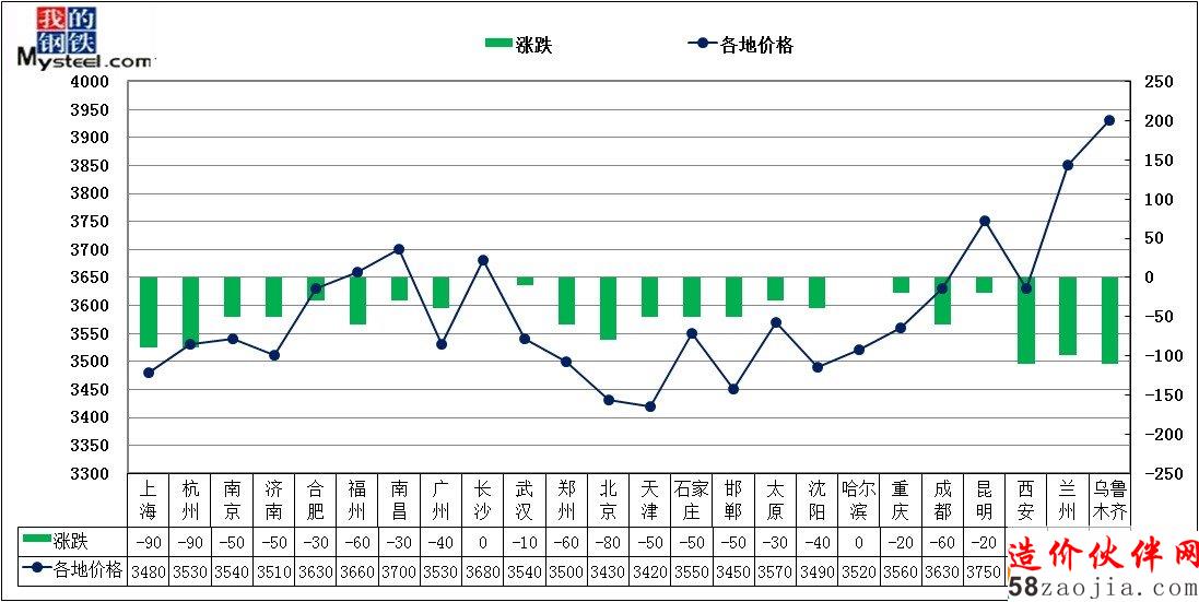 据“”统计,本周五全国主要城市4.75mm热轧板卷均价358/吨,比上周五均价3637元/吨下跌51元/吨。本周市场继续延续跌势,西北地区市场跌幅超过100元/吨,而上海和杭州市场加速下跌,跌幅也达到90元/吨。国内三个大市场之间的价差拉大,天津、上海和市场之间的差价仅仅50元/吨左右。