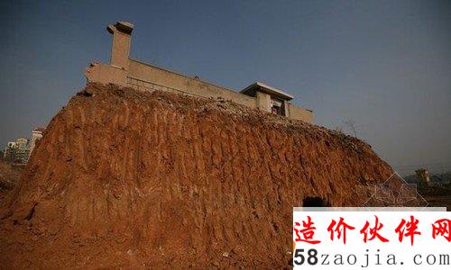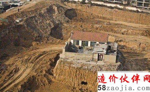 2013年12月24日,青岛城阳区山水嘉园小区附近、黑龙江路路边上一处工地里的钉子房就像一座孤岛一样。房子正处于工地的中央位置附近,而整个工地里,四五辆大货车停在里面,整个工地里有被它们车轮来回碾出来的圈,正好将房子包围了起来。工地已经下挖足有四五米的深度,而遗留的这处四间老瓦房孤零零在那里,被推到了这样的高度,远远看去就像是一个小的孤岛。