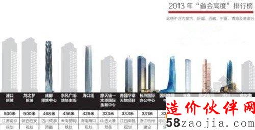 记者通过走访、对照《摩天城市报告》及公开资料,制作出“2013年全国省会城市高度排行榜”,即以一个省会城市已建成、在建、规划或论证阶段的“第一高楼”代表这个城市的高度并进行排名。统计发现,最高的省会城市是长沙,高度为838米;最低为哈尔滨,高度为288米。其中,高于600米的有4个城市,500~600米之间的有11个城市,400~500米之间的有3个城市,300~400米之间的有6个城市,低于300米的只有两个城市。