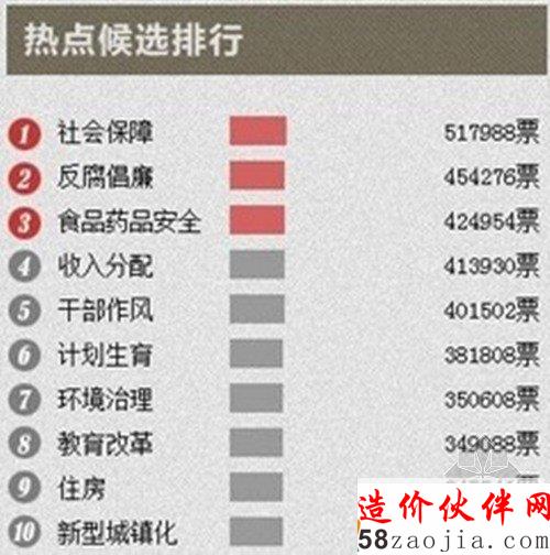 摘要:2014年2月10日,人民网连续第13年推出两会热点调查,向网友收集对热点关注问题的投票和意见留言。截至2月28日9时,已有超过335万人次投票,其中“住房”获得网友投票34万票,暂居热点问题第9位,“社会保障”、“反腐倡廉”、“食品药品安全”暂时分列前三位。在分项调查中,对于目前房价是否在可承受范围,近9成网友表示“根本不能承受”。