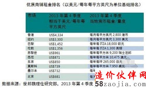 摘要:随着全球各大高端品牌驱动全球商铺租金上涨,顶尖城市之间的竞争也变得越发激烈。商业地产服务和投资公司世邦魏理仕(CBRE)2月27日发布的《2013年第四季度全球商铺租金观察报告(Q4 2013 Global Retail Rents)》显示,在全球各主要城市纽约、巴黎和伦敦优质商铺租金持续创造历史新高背景下,香港依旧稳居全球最昂贵铺租市场首位,而北京位列榜单第十位。