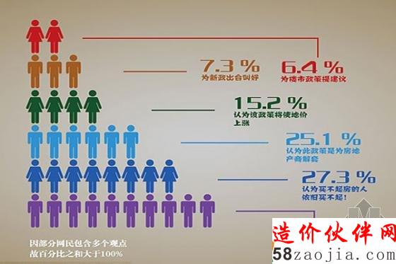 据中青舆情监测室抽样统计分析,有25.1%的网民认为楼市新政策是为房地产商解套,只有15.2%的网民认为该政策将会使地价上涨。为出台新政策点赞叫好的网友只有7.3%。