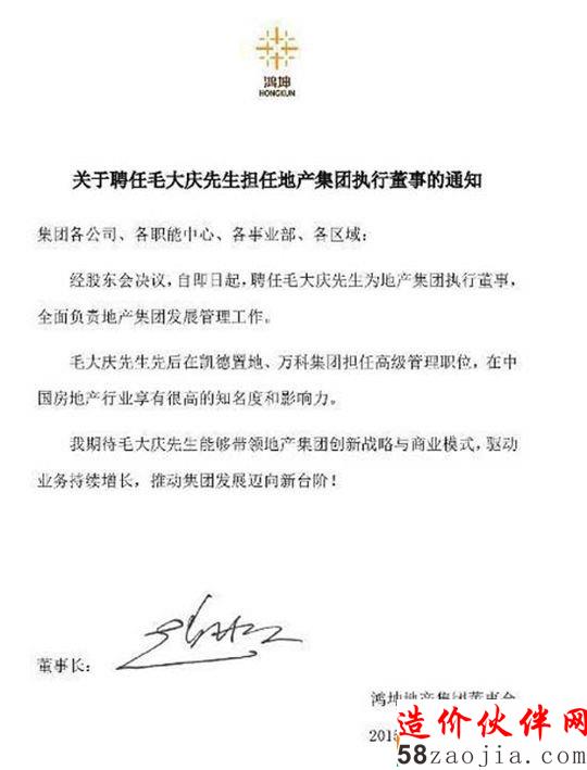 毛大庆属地产圈明星职业经理人,近一年的时间里,地产圈有关毛大庆离职、跳槽的传言屡次抢占头条,事实证明空穴来风未必无因。在聘任通知出来前一天,毛大庆的微信公众账号发布了《毛大庆:追梦青春,创业无悔 — —五四青年节随感》,感慨道“属于我们的青春,并不仅仅是特定的某个年龄段,而是寻找梦想、追逐梦想并最终实现梦想的一段奋斗征程。而在希望所指引的奋斗征程中,我们等待着那终将属于我们的果实。”近年来鸿坤集团扩张之势明显,商业地产布局已经初成体系,聘任通知的末尾是以董事长赵彬口吻叙述的一段话,“我期待毛大庆先生能够带领地产集团创新战略与商业模式,驱动业务持续增长,推动集团发展迈向新台阶!”