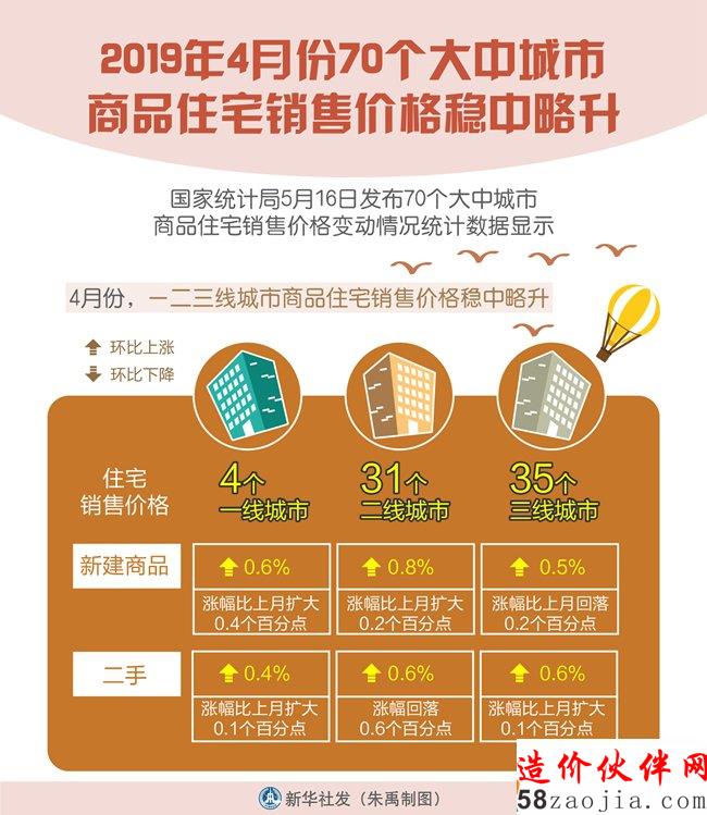 数据显示,4月份,4个一线城市新建商品住宅销售价格环比上涨0.6%,涨幅比上月扩大0.4个百分点,其中北京、上海、广州和深圳分别上涨0.5%、0.3%、1.1%和0.4%;二手住宅销售价格环比上涨0.4%,涨幅比上月扩大0.1个百分点,其中北京、上海和深圳分别上涨0.6%、0.5%和1.1%,广州下降0.4%。31个二线城市新建商品住宅销售价格环比上涨0.8%,涨幅比上月扩大0.2个百分点;二手住宅销售价格上涨0.6%,涨幅回落0.6个百分点。35个三线城市新建商品住宅销售价格环比上涨0.5%,涨幅比上月回落0.2个百分点;二手住宅销售价格上涨0.6%,涨幅扩大0.1个百分点。