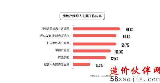 58安居客房产研究院、58房产经纪大学联合调研结果显示,打电话寻找房、客资源占据了房地产经纪人大部分的时间,此外,发布和刷新房源信息、电话邀约客户及带客看房等也是经纪人的主要工作内容。互联网及创新技术的发展为经纪人的工作提供了极大便利,网络的“去”地域性和便捷性,愈发高效地连接着房地产经纪人与找房用户,58同城、安居客等网络端口网依然是其首选的获客渠道。