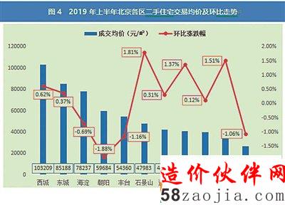 2019年上半年北京各区二手房住宅交易均价及环比走势 数据来源:我爱我家研究院