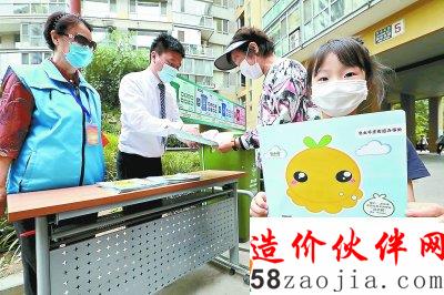 在锦秋家园小区,物业工作人员和社区志愿者配合行动,宣传普及垃圾分类知识(饶强/摄)