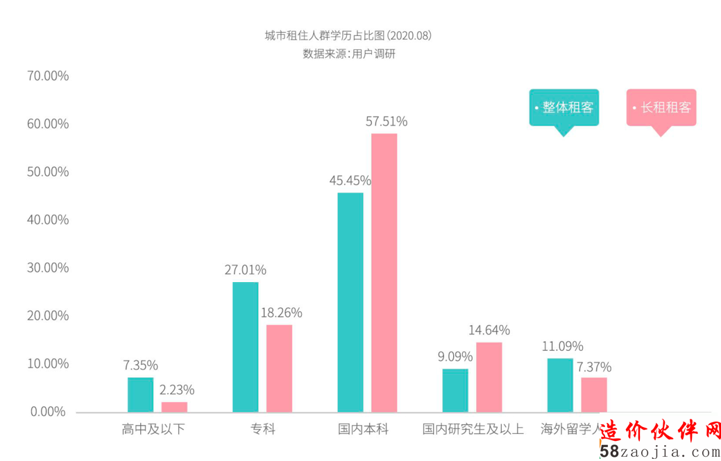 数据显示,整体城市租客群体中,本科及以上学历租客占比超过65%。而在长租机构租客中,本科及以上学历租客占比近8成。值得一提的是,整体租客群体中海归租客占比突破10%,已成为城市租住群体的重要组成部分。