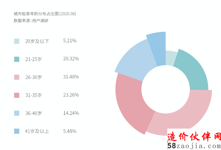 具体来看,年轻化是新生代租客标志性的特征之一。从基础的年龄构成来看,在城市租住人群中,30岁以下占比超过55%,其中26-30岁(1990年-1994年)的租客占比达到31.48%。值得关注的是,00后租客占比超过5%。