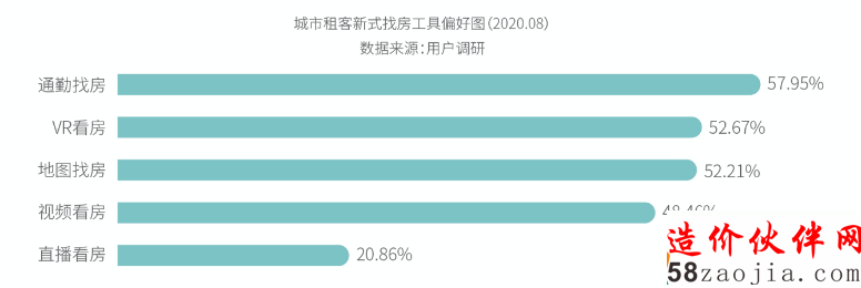 具体来看,在找房、看房体验上,各类新式找房工具崛起。调研数据显示,在各类的新式找房工具中,线上“通勤找房”最受欢迎,“VR看房”、“地图找房”位列2、3位,均有超过半数的城市租客群体表示曾使用过上述新式找房工具。此外,在直播兴起和上半年疫情的影响下,由房东、平台工作人员直播介绍房源的“直播看房”模式也成为租房时选房新偏好之一。