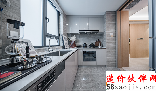 约2.8m大面宽的西式厨房,L型的流畅动线设计,空间奢阔有序。