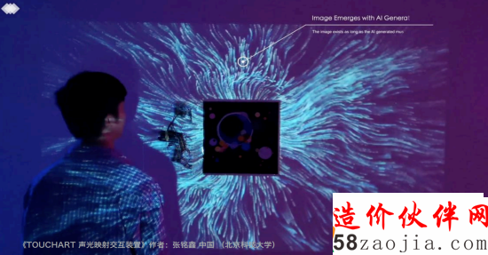 同时,也不乏可互动的人机交互作品。《声光映射交互装置》让声光映射在墙壁之上:触摸之时,音符与人工智能生成的乐段伴随着数字影像,声光电带来了精微曼妙的感受。