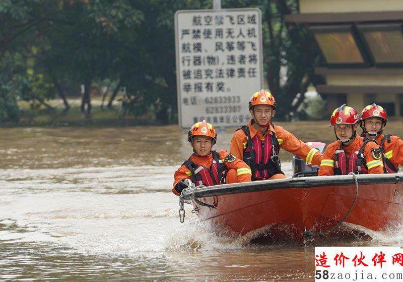 消防队员驾驶救援船在被洪水淹没的城市街巷中巡逻搜救。刘潺 摄