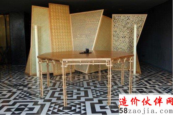 除了以竹编为载体探讨中国竹与茶文化中,材质、工艺、器物使用间的交互影响,石大宇更一改传统屏风的长形立面与直立式结构,完成了不规则造型立面、非垂直站立却能平衡稳重的设计挑战,为屏风设计开拓崭新领域;〝屏七贤〞前方陈设为展览特别定制的〝桌八方〞以及石大宇代表性竹椅作品:椅刚柔、椅君子、椅琴剑,供北京国际设计周八方群贤举行论坛或会议所用。