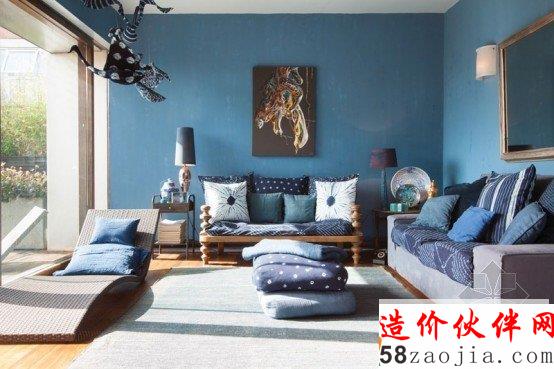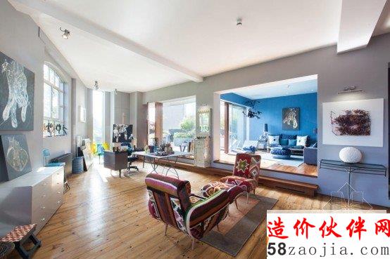 这是一间位于伦敦的公寓,丰富多彩的颜色和纹理,整个空间都弥漫着艺术的气息,蓝色和灰色的房间与一个疯狂的吊灯,充满自然光的玻璃墙与民族风格的家具,老式木制艺术品,多姿多彩的一个疯狂空间。