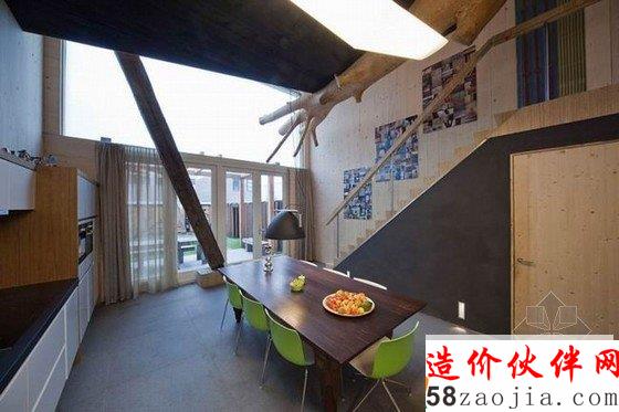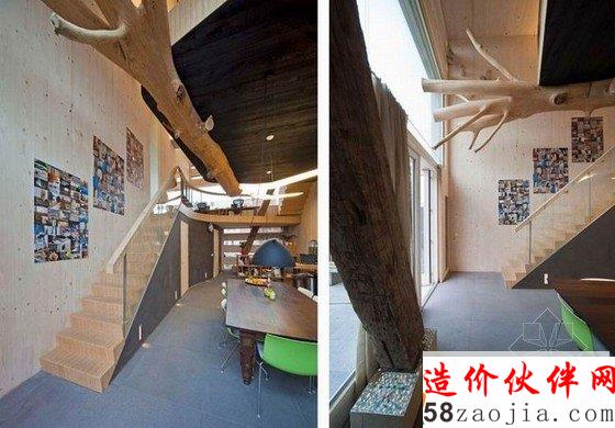 阿姆斯特丹有趣个性的住宅设计是由FARO Arquitecten 工作室精心打造的。室内具有十分质朴的元素:木板墙、肉眼可见的横梁、作为装饰品的大树干,整间房子尽量保持了最原始的状态,木材表面没有加上任何修饰遮盖,一整棵大树干半悬在空中,“托”住二楼,做出摇篮的造型。有趣的当代设计,彰显了个性。