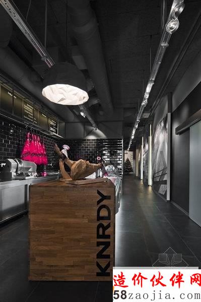 匈牙利KNRDY牛排酒吧餐厅设计,牛排酒吧餐厅设计占地250 ㎡,由须藤室内建筑设计,整个餐厅都使用了 L 型钢铁构造,黑色的材质占据了空间的大部分,营造出戏剧化的舞台效果,温和的球灯光线温暖并能契合工业风的主题。