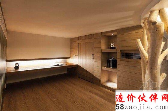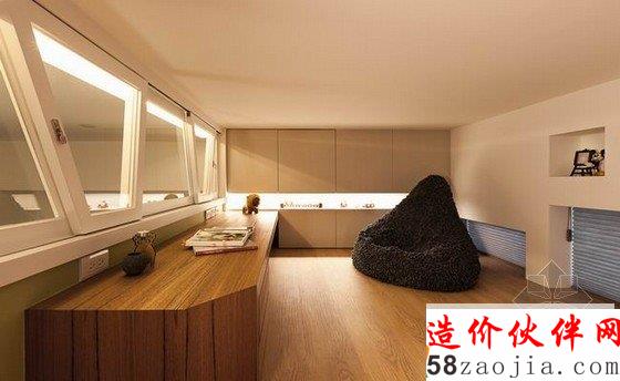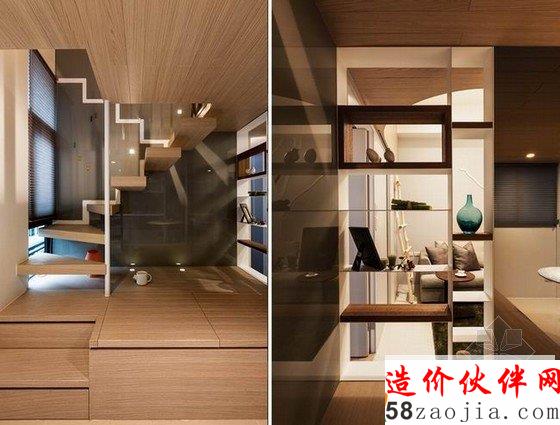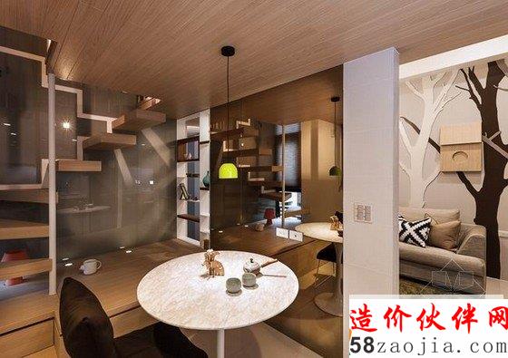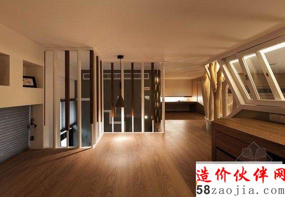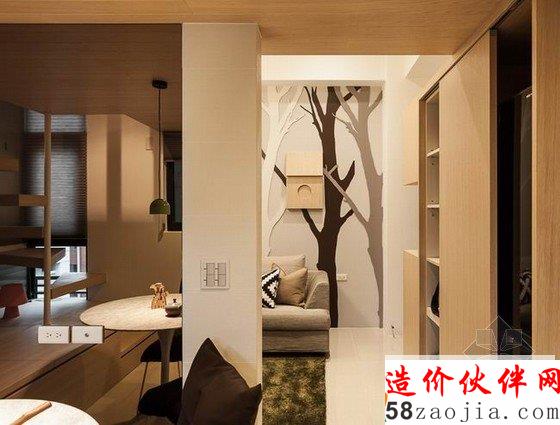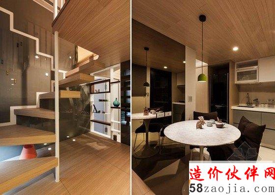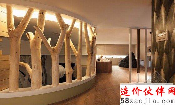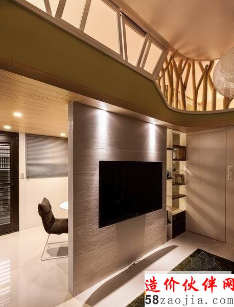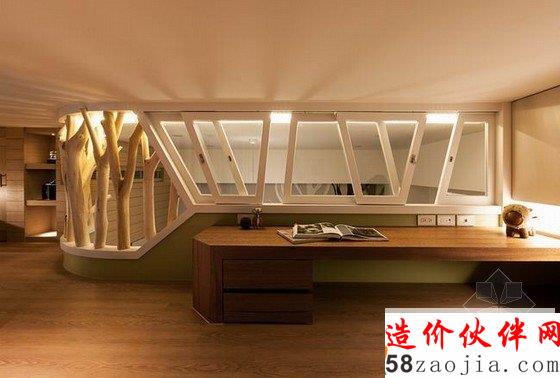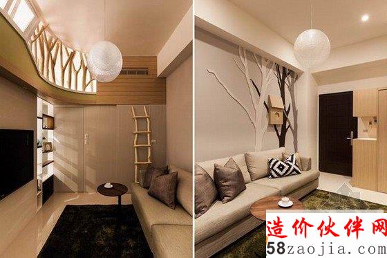 这间位于台北市中心的新成屋,在一开始讨论室内设计方向时,屋主便出希望能营造出一个让人放松的自然风格空间,于是设计师以森林及自然发想,加上与屋主的沟通激荡,发展出“城市树屋”的概念作为整个案子的设计主轴。大多数的人,都具有喜爱亲近自然的天性,在这个满足 Kidult 需求的设计案例中,设计师说:“我们不能搬进森林里,那就把森林搬进家里吧!”整间屋子里,处处可见风格清新温暖的自然元素,除了采用柔和的自然色系家具外,大量木作材质的运用也让空间的风格更趋一致。特别以雷射切割木作,做出具有层次的树林造型墙,并且以融合背景的趣味鸟屋巧妙遮盖电源总开关,让人激赏设计师的巧思。空间总共只有50㎡,因为楼层挑高,设计师以夹层方式将空间区分为上下两部分。在争取更多可以运用的空间,思考如何增加空间使用效能的同时,以虚实交错的方式,及大面积镜面墙面运用,营造出穿透感,让空间在视觉上显得较实际面积更为开阔。改变主卧与餐厅的隔间,藉由餐厅区及透空的楼梯将阳台的光线引入客厅,让大量自然光充盈其间,呼应着自然诉求的风格。利用大面茶镜,延升视觉的同时也达到放大空间的效果。